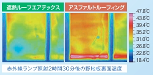 真夏を想定したサーモグラフィー実験では、一般的なアスファルトルーフィングと比べて、野地板裏面の温度を約6〜8℃低下させる効果が確認されています⇩