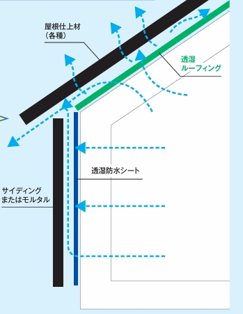 夏の強い日差しによる熱の侵入を防ぎつつ(遮熱性)、屋根内部の湿気を外に逃がす(浸透性)ことができる高性能ルーフィング材