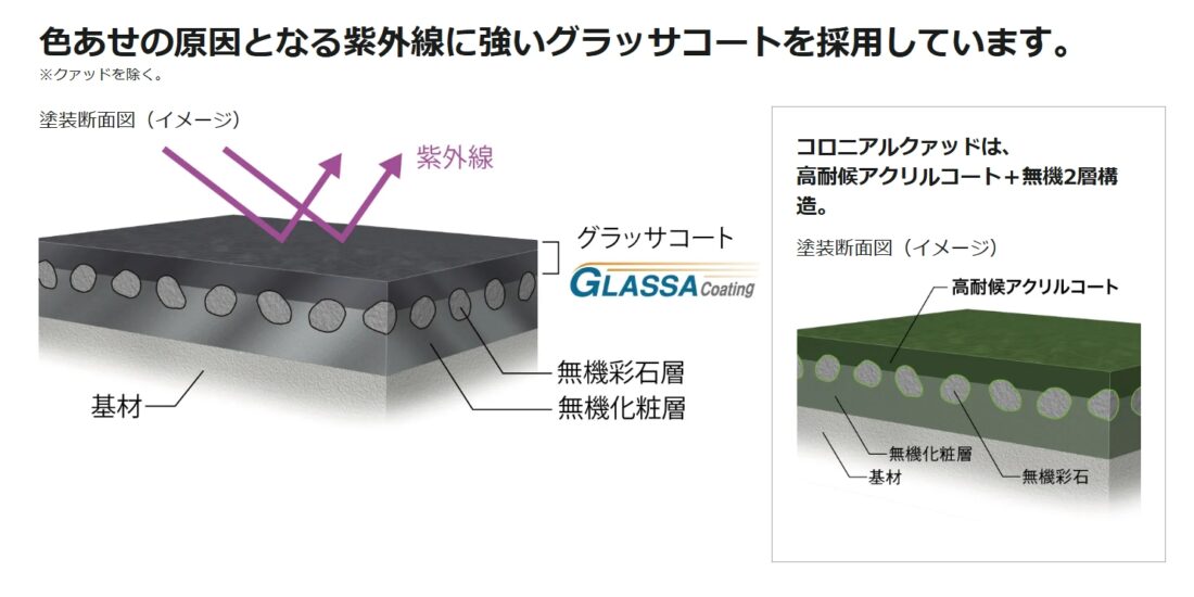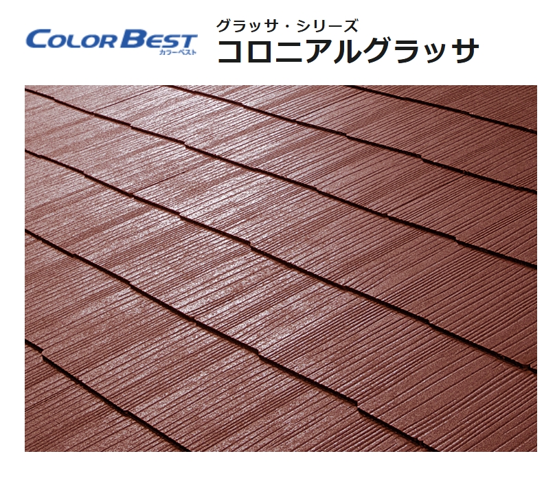 そして、主に戸建て住宅に使用されているスレート系屋根材の一種です。一般的に「コロニアル」「カラーベスト」と呼ばれる屋根材のなかでも、表面に無機系のコーティングを施し、耐候性や耐久性を高めたタイプがコロニアルグラッサです。